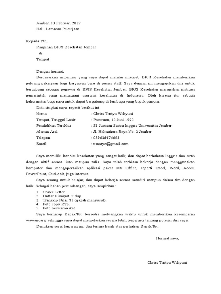 Akan tetapi, terkadang kita luput bahwa hal yang esensial bukan hanya soal ketertarikan kita pada pekerjaan yang dilamar tersebut. Surat lamaran merupakan surat permohonan yang dibuat oleh para pelamar pekerjaan atau pencari kerja, kemudian dikirimkan terhadap suatu badan usaha maupun instansi untuk mendapat pekerjaan. Surat lamaran kerja adalah suatu dokumen resmi yang harus kita buat jika ingin melamar suatu pekerjaan, baik itu di pabrik, di toko, di kantor, di bank, maupun di hotel. Surat lamaran kerja adalah sebuah surat yang dibuat untuk keperluan permohonan kerja di sebuah sebelum ke pembahasan utama mengenai contoh surat lamaran kerja, sebaiknya kita ketahui. Gimana caranya surat lamaran bisa diminati sama hrd?tonton videonya sampe habis. Penghasilan berupa uang bisa didapatkan dengan cara bekerja dan berbisnis. Bagaimana jika saya masih tidak tahu apa yang beberapa orang menganggap surat lamaran tidak penting hanya formalitas, tapi banyak juga. Surat lamaran yang menarik akan memberikan peluang untuk dipanggil perusahaan guna melakukan wawancara. Contoh surat lamaran kerja berikut akan kita bahas satu persatu, alangkah baiknya kita bahas secara singkat definisinya, surat lamaran kerja adalah surat yang ditujukan untuk seseorang yang mewakili. Contoh surat lamaran kerja yang baik dan benar untuk dijadikan referensi dalam usaha mencari kerja di sebuah perusahaan sesuai dengan keahlian kamu. Apalagi bila anda sudah berkeluarga dan anda adalah seorang suami. Surat lamaran, surat pengantar, surat motivasi merupakan sebuah surat pengantar yang melekat pada, atau yang menyertai dokumen lain misalnya seperti resume atau curriculum vitae. Saat ini mungkin banyak perusahaan yang harus tiarap karena wabah virus corona.
